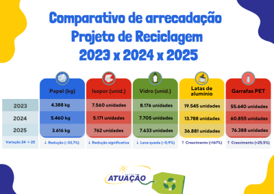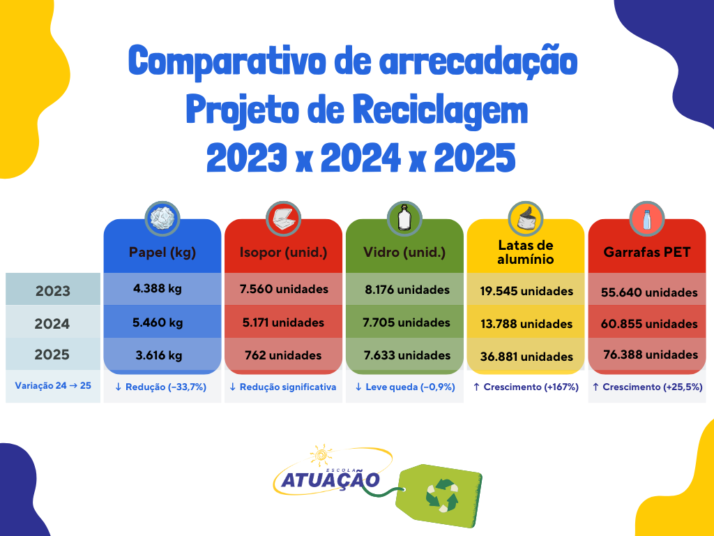 Criado há mais de uma década, o projeto de reciclagem da Escola Atuação tem como objetivo promover responsabilidade ambiental, incentivar a coleta seletiva e envolver a comunidade escolar em ações de preservação. A iniciativa integra o currículo pedagógico e reforça princípios de cidadania, sustentabilidade e colaboração.